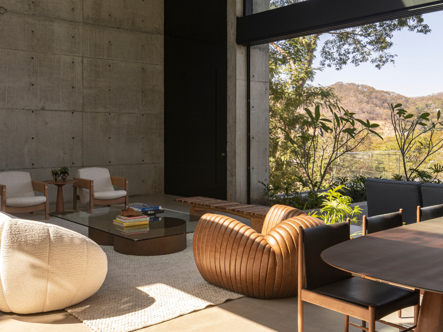 El concreto aparente define la materialidad predominante de la vivienda, mientras que el granito cepillado se incorpora en planos verticales estratégicos para introducir contrastes sutiles de textura y reforzar la lectura independiente de los volúmenes. La elección de una paleta de materiales contenida contribuye a la coherencia visual del proyecto y enfatiza su lógica estructural.