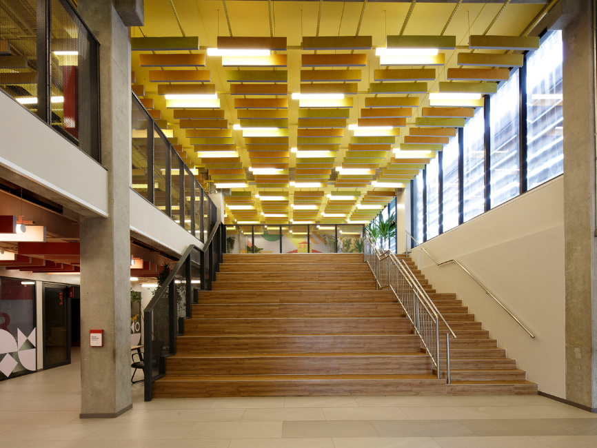 Asimismo, vacíos estratégicos en las fachadas y la disposición de “escaleras-butacas” permiten que la circulación se convierta en espacio de socialización, recreación y descanso, reforzando la convivencia y el dinamismo propio de una institución educativa.