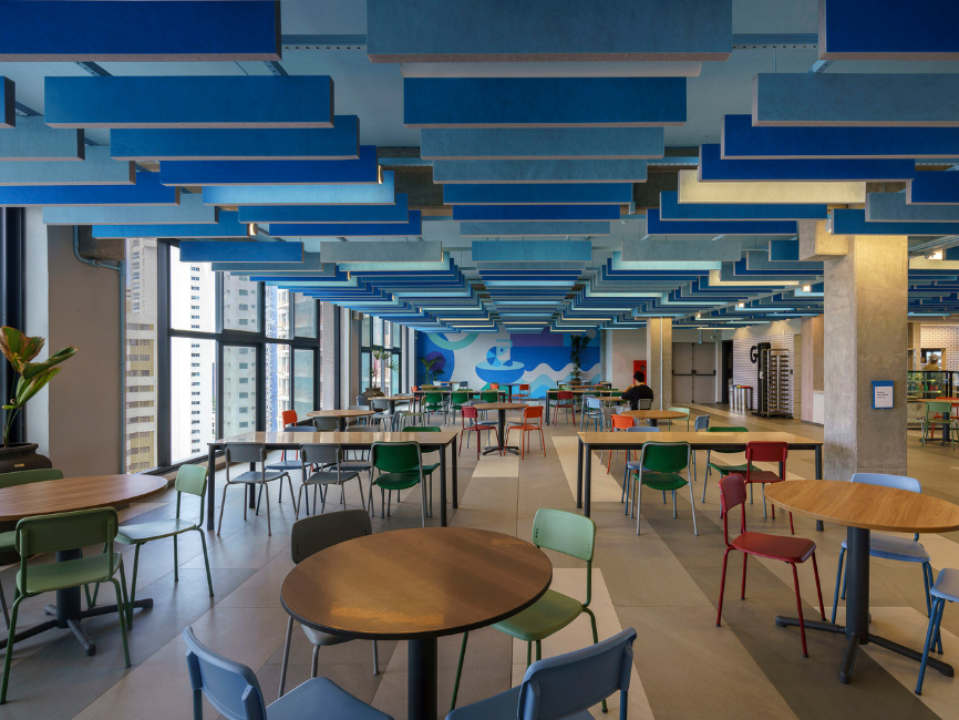 El diseño interior también refuerza la identidad visual del colegio mediante un sistema de señalización y gráficos modulares: cada nivel o grado tiene asignado un color y patrón que simbolizan el progreso educativo, haciendo del entorno un espacio no solo funcional sino significativo en términos pedagógicos.