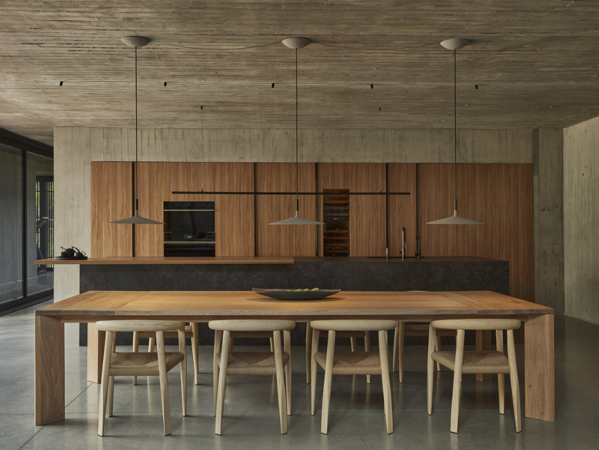 Aunque la estructura se basa en materiales industriales y pesados, el interior responde con sensibilidad y calidez. La escalera, elementos de madera de roble, y mobiliario diseñado por Studio KP2 + Cinco Sólidos transforman el interior en un ambiente habitable, cálido y refinado. Cortinas de lino, tapetes de algodón de gran formato y acabados cuidadosos completan ese contraste entre la rudeza del exterior y la comodidad del interior.