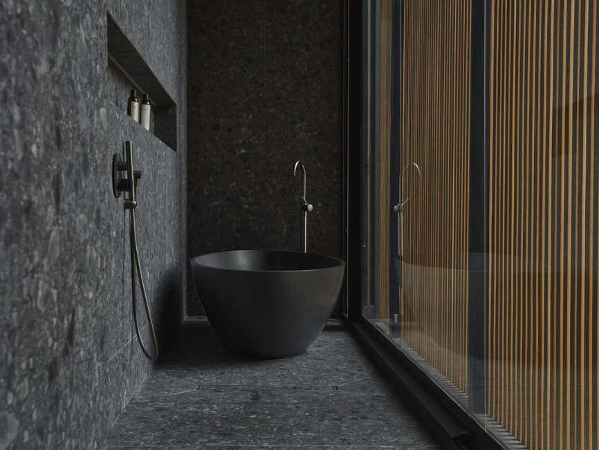 Un detalle estructural clave una columna de concreto en forma de «V» que se sumerge en la piscina de piedra Bali negra sostiene el ala superior de la casa y se convierte en el eje identitario del proyecto.
