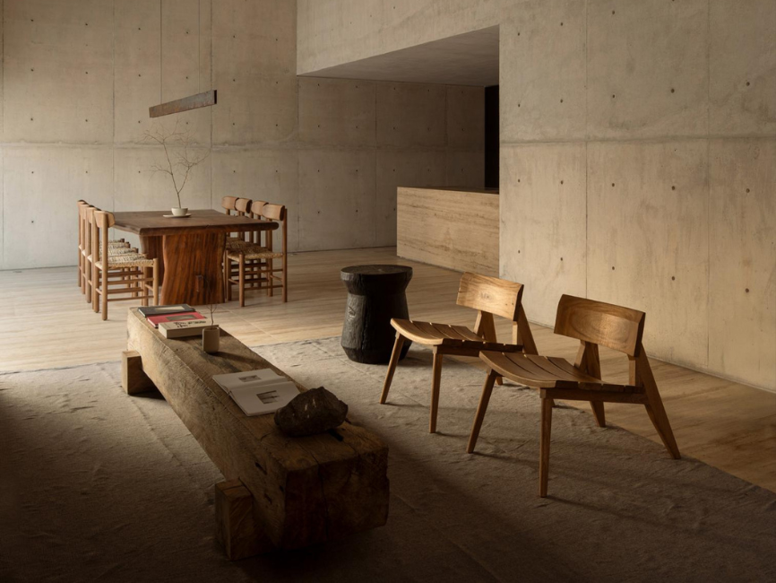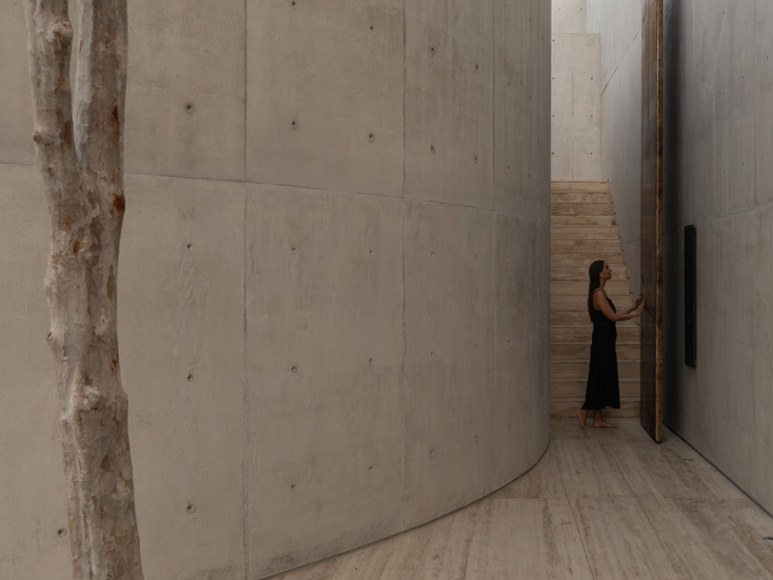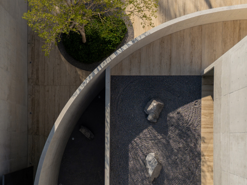 Un muro curvo define un umbral acogedor al ingreso, acompañado por un árbol que da la bienvenida con sutileza, como si fuera parte de un arreglo floral. La casa no se abre al vecindario; más bien, se repliega discretamente y ofrece sus estancias como atmósferas meditativas. Es una arquitectura que persigue la sombra, tanto como resguardo físico como metáfora poética.