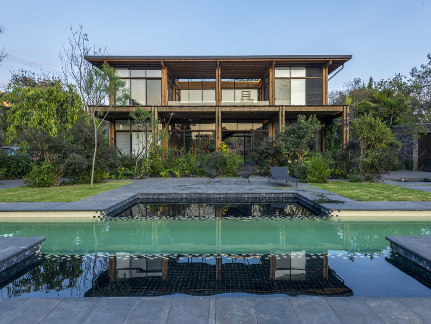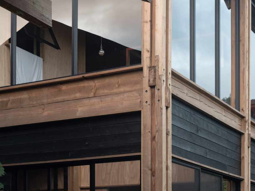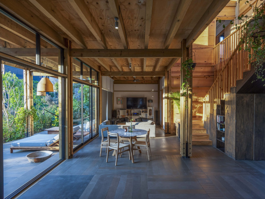 Los acabados dialogan con la intención ecológica del sistema: las fachadas exteriores se revisten con duela tratada mediante la técnica japonesa shou sugi ban —que carboniza la superficie para aumentar la resistencia al agua y al fuego—, mientras que en el interior se emplea triplay de pino que puede conservarse en tono natural o recibir tratamientos decorativos. La madera domina el repertorio material por su carácter renovable, su capacidad para almacenar carbono y su posibilidad de reaprovechamiento, lo que sitúa al proyecto dentro de una discusión más amplia sobre vivienda sustentable y de bajo impacto.