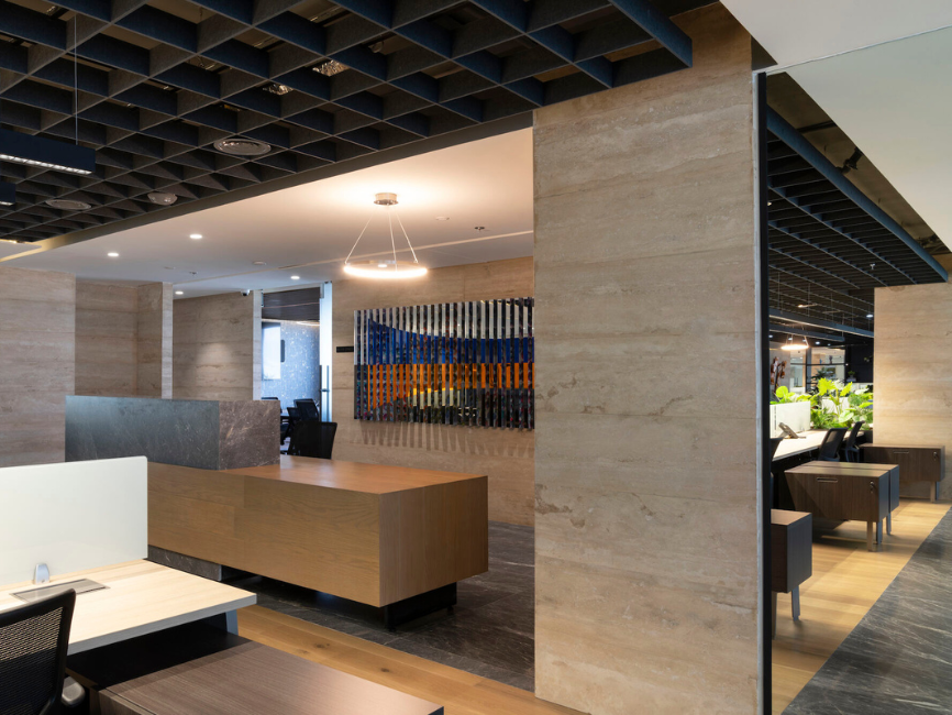 Los materiales elegidos  incluyendo muros revestidos en travertino y una combinación de pisos en alfombra, madera ingenierizada y mármol Bardiglio buscan elevar la calidad del entorno de trabajo y ofrecer una sensación de calidez y sofisticación. La integración de la naturaleza y la biophilia es un eje central: áreas de descanso, espacios de recreación y rincones verdes están cuidadosamente pensados para fortalecer la conexión con el entorno natural, incentivando la creatividad, la salud y el equilibrio entre trabajo y vida personal.