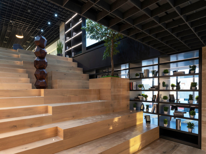 La propuesta se despliega en dos niveles interconectados, articulados por una escalera central que funciona también como un pequeño auditorio, generando un elemento expresivo y multifuncional. El diseño interior integra elementos que favorecen la colaboración y el confort, como un plafón reticulado que refuerza el control acústico y la distribución de luz, así como particiones de vidrio que aportan luminosidad y sensación de apertura.