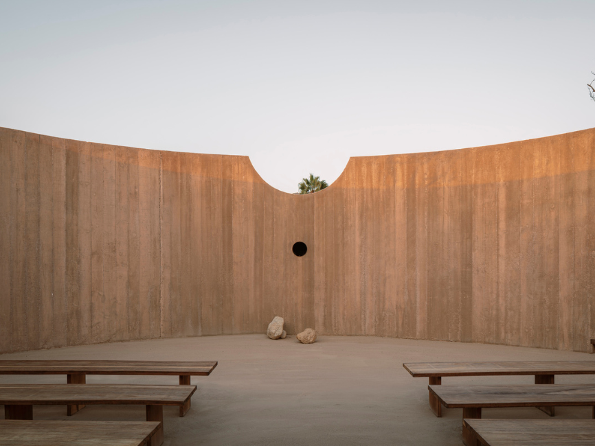 La arquitectura del recinto enmarca cuidadosamente el paisaje circundante. Una apertura semicircular permite vistas panorámicas hacia las montañas, mientras que el muro circular delimita el cielo, creando un espacio introspectivo. La orientación este-oeste de la estructura permite que el movimiento del sol refleje el paso del tiempo y los matices cambiantes de la luz en el desierto.