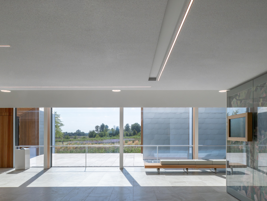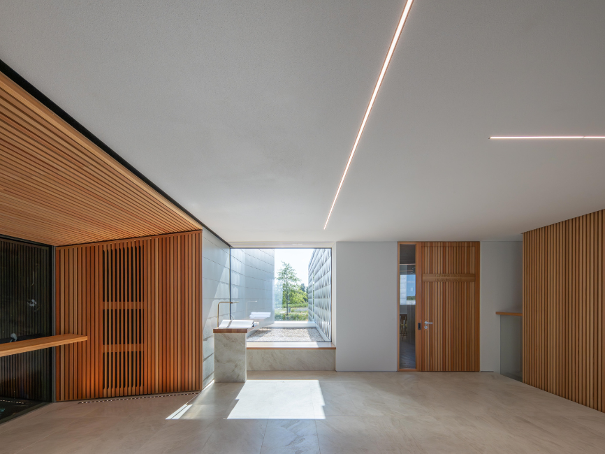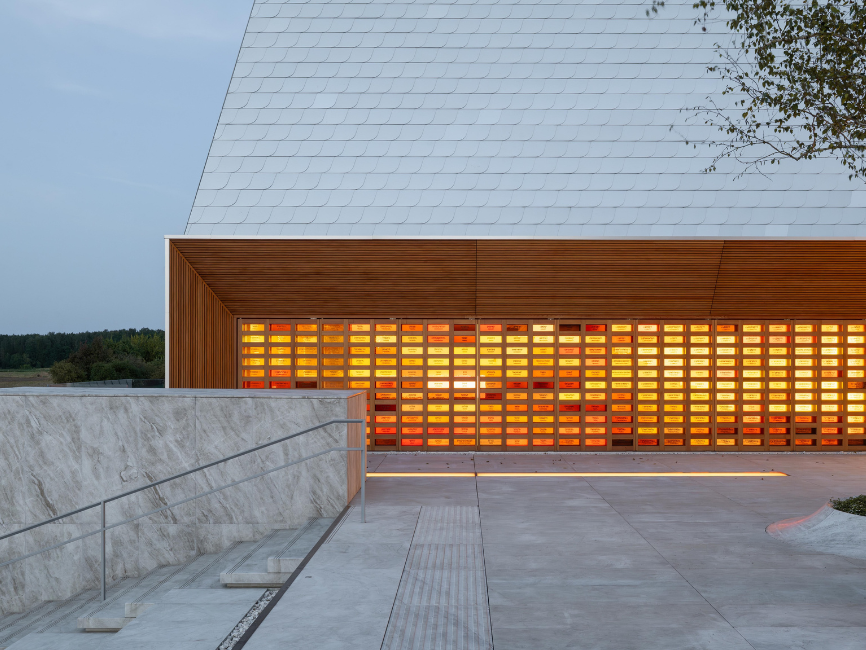 El conjunto se complementa con un parque memorial que extiende la experiencia hacia el paisaje. Diseñado como un espacio de contemplación, incorpora senderos, praderas y elementos naturales que remiten a la memoria del lugar y a los acontecimientos trágicos ocurridos en la región durante 1941. Este recorrido exterior refuerza el carácter reflexivo del proyecto, estableciendo un vínculo entre historia, territorio y recuerdo.