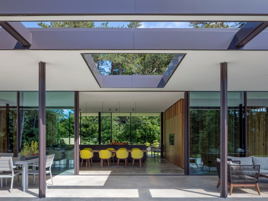 La residencia se caracteriza por su volumetría horizontal y baja, que abraza el terreno, escondiéndose entre la vegetación y las suaves elevaciones del lugar. Gracias a su orientación y a sus grandes aberturas estratégicas, se aprovecha al máximo la luz natural y se logra una conexión visual profunda entre los espacios interiores y el entorno natural.