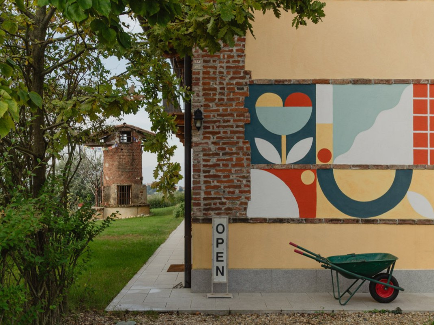 Para realzar la vista de la vivienda desde la calle, la diseñadora gráfica, ilustradora y muralista Alice Lotti creó un mural que acompaña el camino hacia la entrada principal. Esta intervención no solo marca la llegada, sino que también anticipa la paleta de colores y el carácter estético de todo el proyecto.
