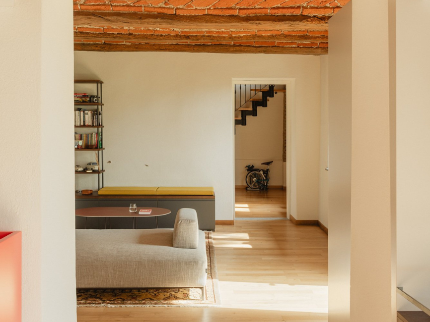 El dormitorio principal, ubicado en la primera planta en la esquina del edificio, cuenta con dos ventanas que ofrecen vistas panorámicas de la colina. Un nuevo muro se extiende justo debajo de la viga maestra, creando un fondo para la cama y delimitando el vestidor, integrando funcionalidad y estética en perfecta sintonía con la arquitectura de la casa.