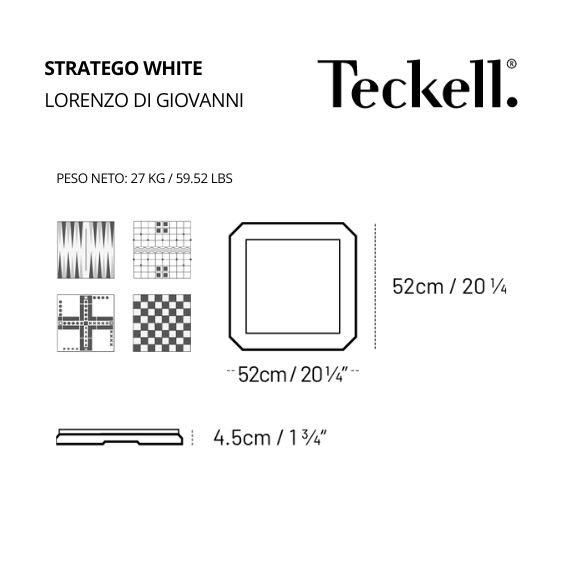 Estrategia, contemplación e inteligencia son elementos clave para disfrutar de los juegos de mesa de Teckell; pero, sobre todo, se necesita tiempo: un regalo inusual en esta era agitada. Un tablero y tres capas de maravilla: una base en mármol blanco Calacatta y un tablero de juego metálico delgado, protegido por una superficie de vidrio templado de bajo contenido en hierro.
