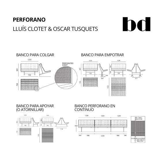 Bancos modelo PERFORANO, elaborado con tubos de acero, con chapa perforada y perfil ergonómico. Disponible en cuatro versiones: para colgar en la pared, para empotrar en el suelo, para apoyar o continuo, acabado en resina de poliéster texturizada en color plata. Una pieza ideal para jardín, parques o zonas comunes.