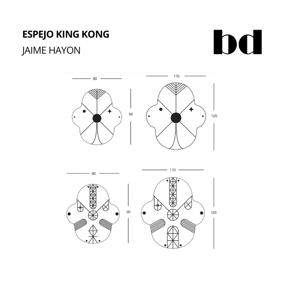 Espejo decorativo modelo KING KONG, de 5 mm de espesor con decoraciones aplicadas en dorado y negro, herrajes de fijación a pared en plancha de acero con acabado zincado blanco. Disponible en dos tamaños.