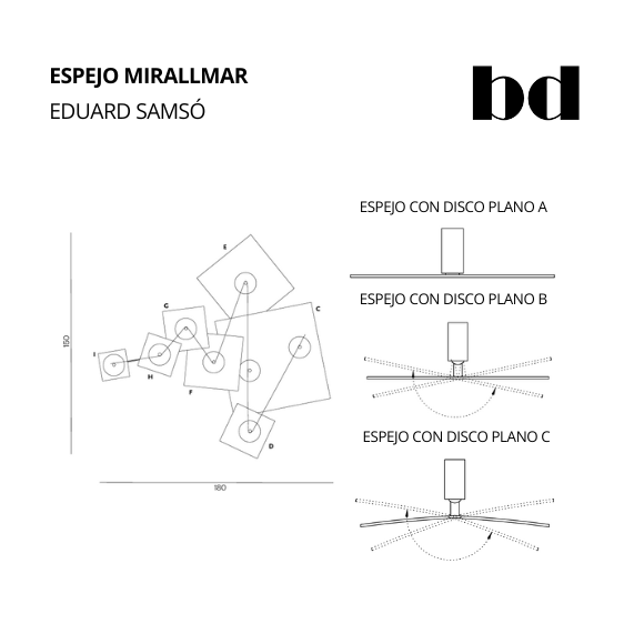 Multiespejo modelo MIRALLMAR, estructura en pletina de acero compuesto por tres módulos independientes unidos por tornillos, formado por 7 espejos cuadrados de doble cara de diferentes medidas, con posición variable, un espejo cóncavo y los demás planos.