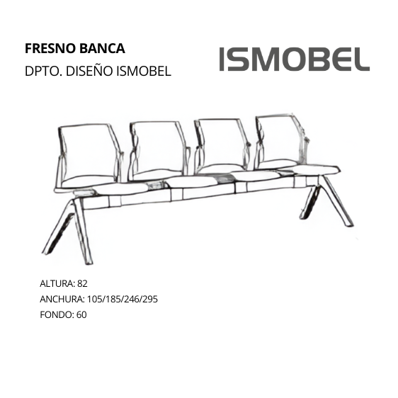La Banca FRESNO de estructura metálica con patas en acero cromado o pintado en forma de T con niveladores antideslizantes. El asiento y respaldo es una monocarcasa ergonomica lisa o microperforado, opcional al tapizar el asiento en los tejidos de catálogo. También cuenta con opción de respaldo de malla con marco en poliamida.