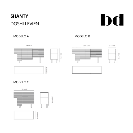 Gabinete de almacenamiento modelo SHANTY, con estructura tubular de hierro, contenedores fabricados en MDF lacados en mate, los cuales se fijan mediante sistema mecánico, puertas en MDF con forma de onda, en la parte superior tiene un vidrio transparente de 8 mm, patas octagonales en aluminio extrusionado, en varios colores.