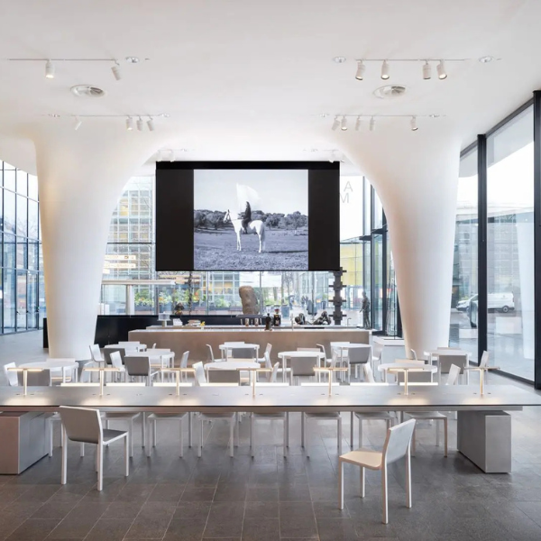 Hecho a mano y rebosante de apetito visual, el aluminio fluye desde las patas hasta el respaldo con una suave cohesión que acentúa su materialidad. Su silueta fluida complementa la suave forma blanca del exterior de los Museos Stedelijk.