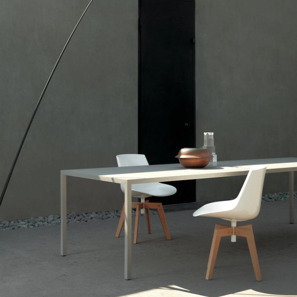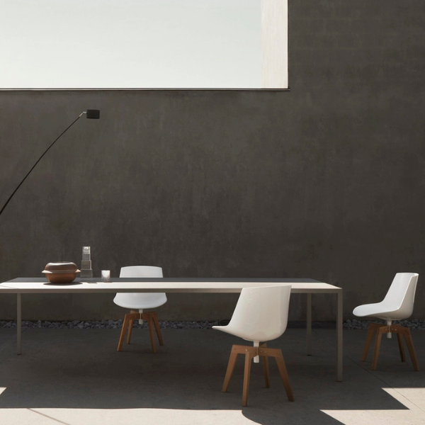 La colección Flow, uno de los diseños emblemáticos de MDF Italia, incorpora una versión con base de madera de iroko especialmente pensada para exteriores. Este material, reconocido por su alta densidad y gran resistencia frente a la intemperie, la radiación solar y los cambios de temperatura, asegura un excelente desempeño en ambientes al aire libre. Su acabado liso y uniforme aporta una estética elegante a la base de cuatro patas con giro de 360°, ofreciendo mayor funcionalidad y comodidad.
