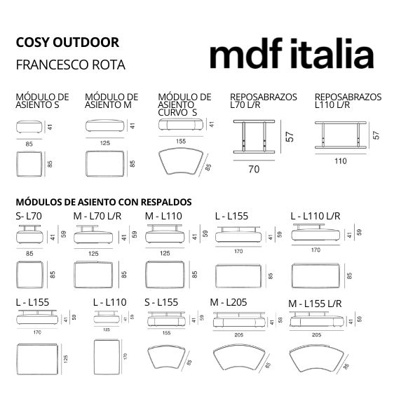 COSY OUTDOOR, La familia del sofá Cosy, diseñada por Francesco Rota en 2017, se amplía con una versión para exteriores. Su modularidad y estructuras de acero inoxidable pintado permiten adaptarse a entornos abiertos, tanto en residencias como en contratos y hostelería. Los módulos tapizados Cosy Outdoor pueden combinarse en diversas configuraciones y también usarse como pufs individuales.