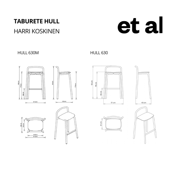 HULL, taburetes que comunican personalidad y fuerza gracias a un marco de tubo de acero de 30 mm de diámetro. Combinan la solidez del metal con la elegancia y la compacidad de la haya, material elegido para el asiento.