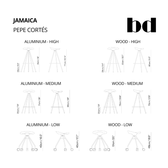 Taburete de moderno modelo JAMAICA, con estructura de 5 patas realizada en acero cromado, asiento giratorio en fundición AG3 pulido scotch y anodizado plata o mecanizado en haya maciza barnizada. Versión taburete bajo con ruedas. Para los modelos de altura h77 y h66 la estructura Y el asiento de aluminio se pueden pintar en anodic black, el asiento de madera en haya puede ir teñido en negro.