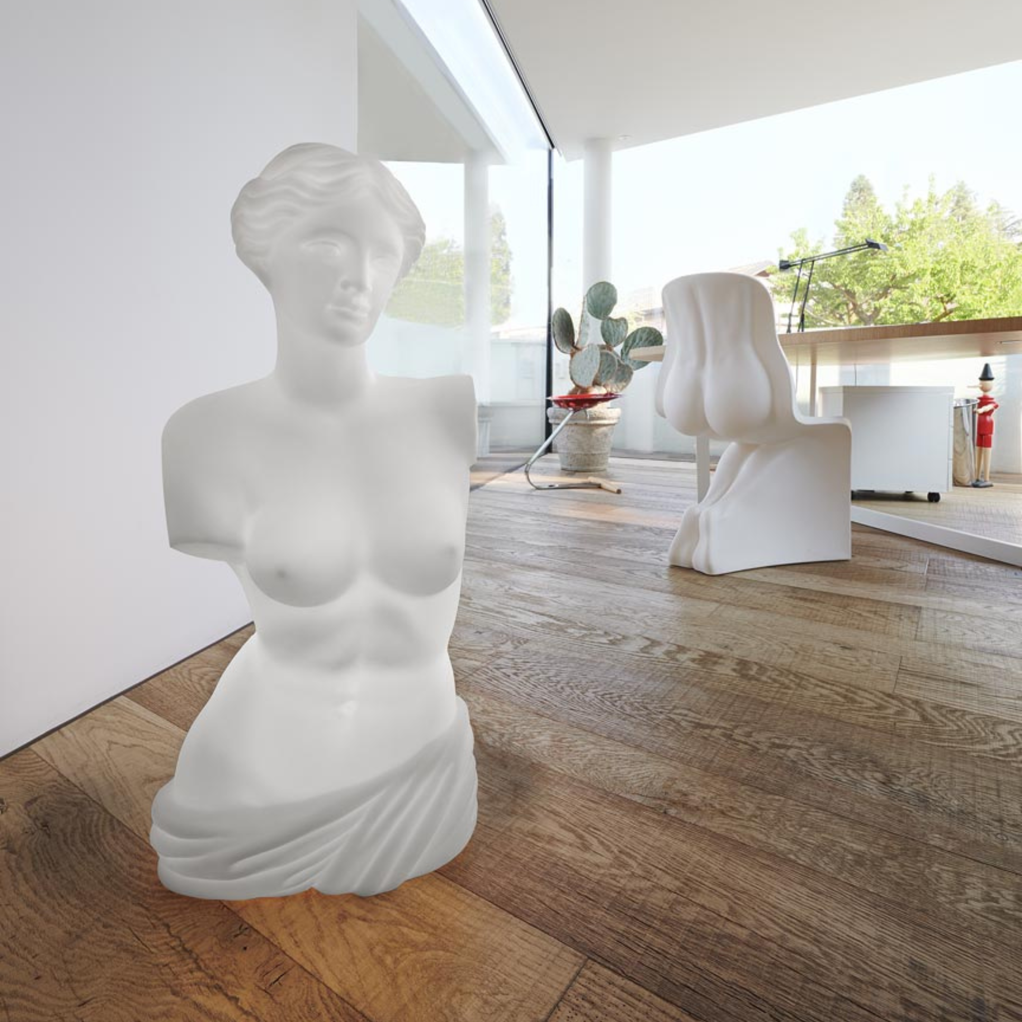 VENUS es una lámpara escultórica luminosa que evoca las formas de la Venus de Milo, una de las obras más célebres de la civilización griega, símbolo de la elegancia y la sensualidad femeninas. Fabricada en polietileno reciclable mediante la técnica de moldeo rotacional, y con un toque pop, VENUS es ideal para todo tipo de espacios interiores contemporáneos.